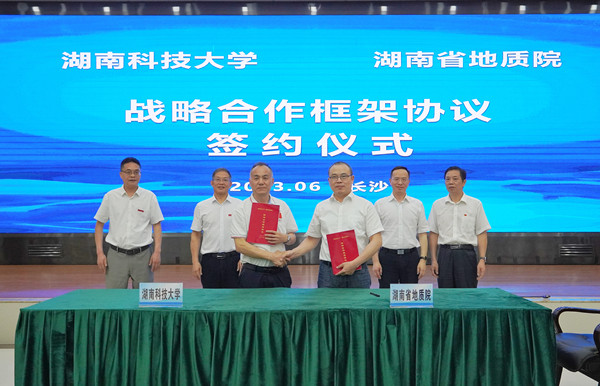 6月21日,湖南省地质院与湖南科技大学在湖南省地质院举行战略合作框架协议签订仪式。省地质院党委书记谈文胜、湖南科技大学校党委书记唐亚阳出席签约仪式并讲话,院党委委员、总工程师曹幼元,湖南科技大学副校长贺泽龙代表双方签署战略合作框架协议。院党委委员、副院长刘向明主持签约仪式。
