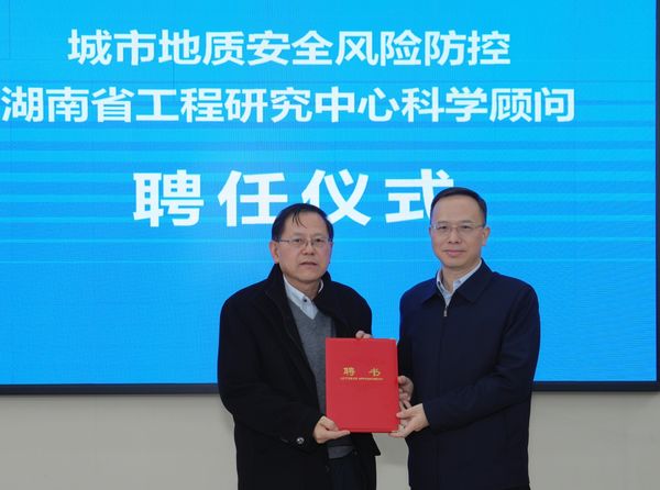 会上举行了专家聘任仪式,谈文胜代表省地质院向朱合华教授颁发了“城市地质安全风险防控湖南省工程研究中心”特别顾问聘书。